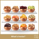 ? A SELECTION OF 12 OF OUR BEST NUTS & DRIED FRUITS: Our Black & Gold Snack Tower includes a handful of each of our 12 signature delicious nuts & dried fruits: Almonds, Walnuts, Cashews, Pistachios, Honey Glazed Pecans, Honey Glazed Peanuts, Brazil Nuts, Dried Cranberries, Dried Kiwis, Dried Papaya, Dried Pears, and Dried Peaches.